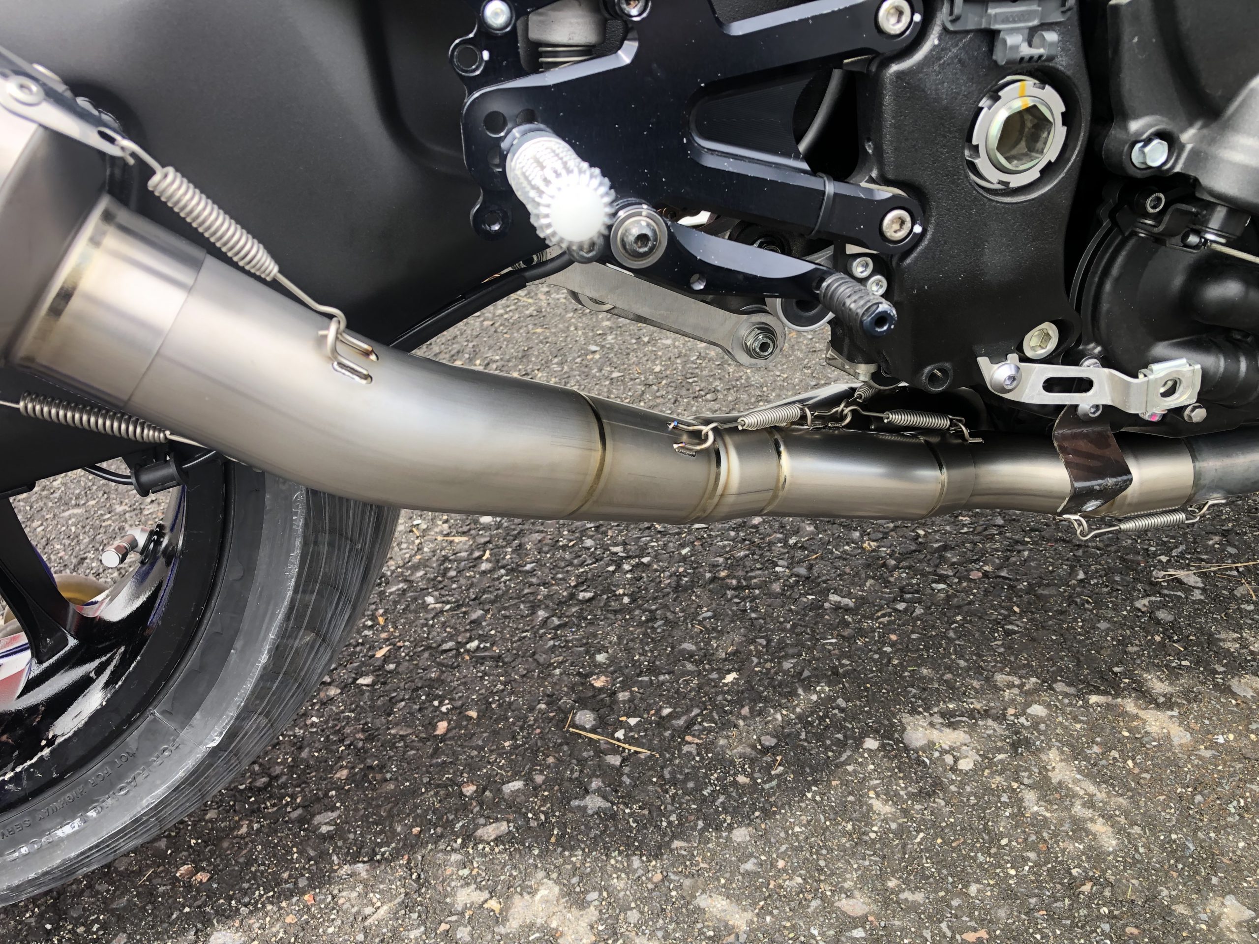 ・純正エキパイ部分を使用し、中間サイレンサー以降を取り換えるレース専用スリップオンマフラーです。